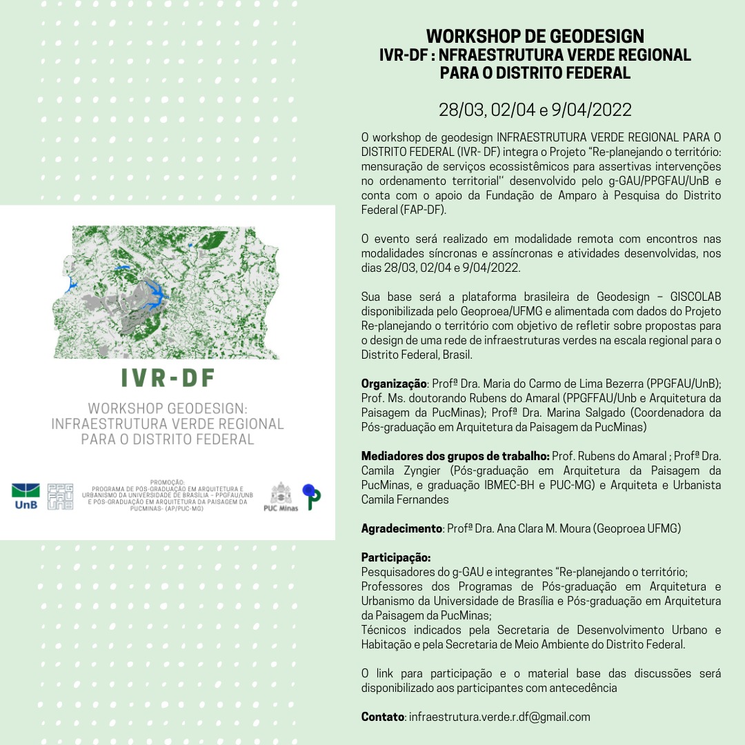 O Grupo de pesquisa em Gestão Ambiental Urbana promove WORKSHOP GEODESIGN- IVR-DF como parte do das atividades do Projeto de Pesquisa `Re-planejando o território: mensuração de serviços ecossistêmicos para assertivas intervenções no ordenamento territorial' que possui o apoio da FAP-DF.